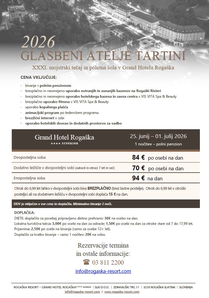 Vabimo vas, da se tudi letos, že 31-ič družimo v idiličnem okolju Rogaške Slatine. V odlično zasnovanem programu dodatnega glasbenega izobraževanja, razpisujemo prosta mesta v Mojstrski tečaj za mlade glasbene talente in Poletno šolo za učence vseh razredov glasbenih šol (dobrodošli tudi začetniki).
